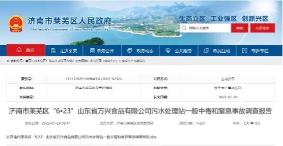 并且前幾天,山東省濟(jì)南市萊蕪區(qū)公布了“6?23”山東省萬(wàn)興食品有限公司污水處理站一般中毒和窒息事故調(diào)查報(bào)告。