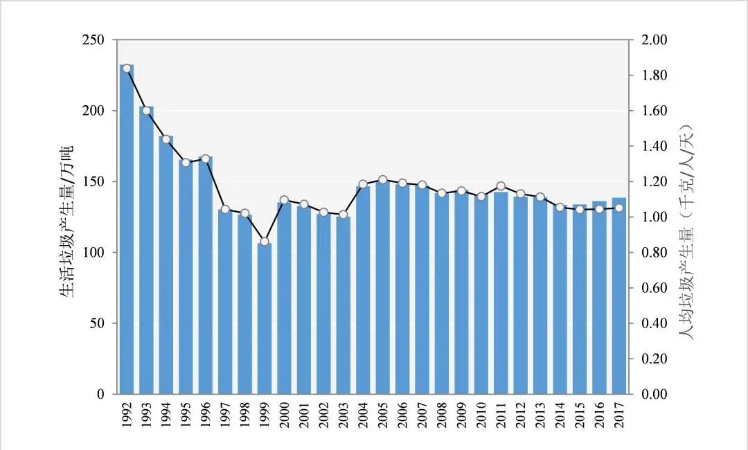 圖1 柏林生活垃圾產生量及人均垃圾產生量趨勢(1992-2017)