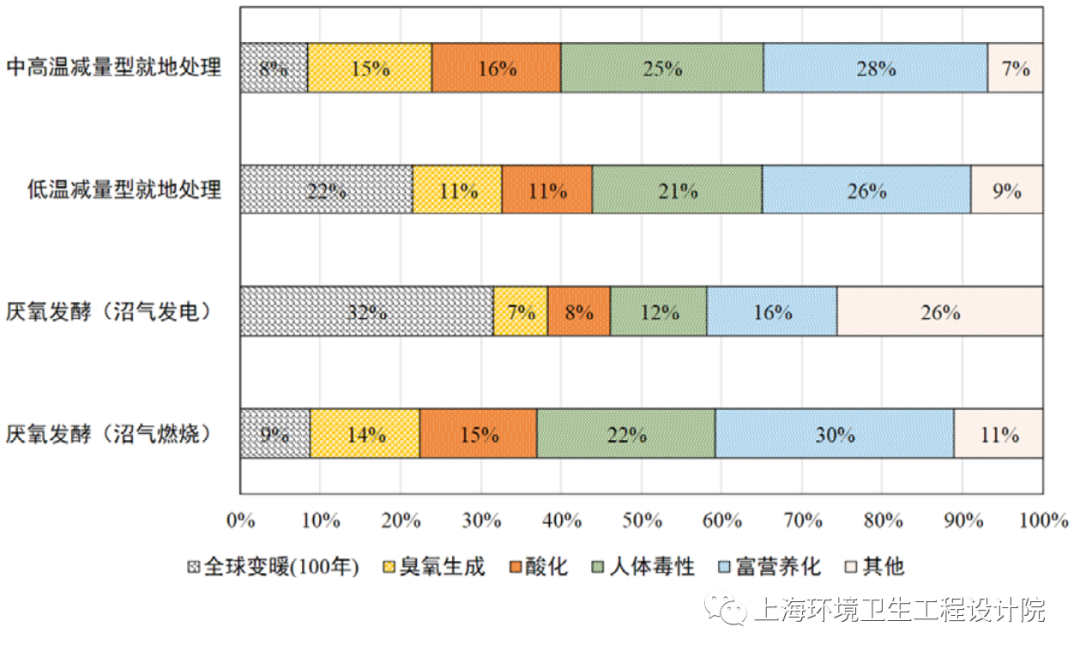 (二)中高溫減量型就地處理工藝的環(huán)境影響最為顯著,主要原因是電耗較高,上游電力生產(chǎn)過程采用燃煤發(fā)電工藝,其排放的磷和重金屬等導(dǎo)致了較為嚴(yán)重的富營養(yǎng)化和人體毒性。