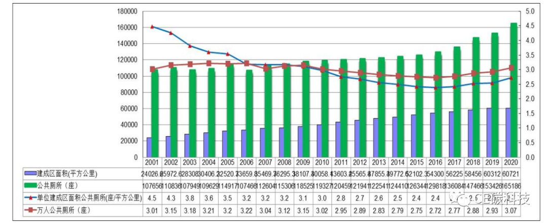 2020年,我國(guó)公共廁所配置數(shù)量為每萬(wàn)人3.07座,單位建成區(qū)面積2.7座/平方公里。上述數(shù)據(jù)均包含附屬式公共廁所,若不考慮附屬式公廁,我國(guó)公廁配置則很難達(dá)到標(biāo)準(zhǔn)要求。