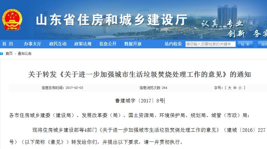 北極星節(jié)能環(huán)保網(wǎng)訊:北極星節(jié)能環(huán)保網(wǎng)獲悉,近日山東省住房和城鄉(xiāng)建設(shè)廳、山東省住房和城鄉(xiāng)建設(shè)廳、山東省發(fā)展和改革委員會(huì)以及山東省國(guó)土資源廳山東省環(huán)境保護(hù)廳聯(lián)合發(fā)布關(guān)于轉(zhuǎn)發(fā)《關(guān)于進(jìn)一步加強(qiáng)城市生活垃圾焚燒處理工作的意見(jiàn)》的通知,通知提到,原則上,全省新上城市生活垃圾處理項(xiàng)目,要一律選擇焚燒(發(fā)電)處理技術(shù),現(xiàn)有生活垃圾處理設(shè)施預(yù)期使用年限小于5年的市、縣,要立即啟動(dòng)生活垃圾焚燒處理設(shè)施項(xiàng)目選址、環(huán)評(píng)、立項(xiàng)、土地征用、規(guī)劃等前期工作,條件成熟的盡快開(kāi)工建設(shè)。