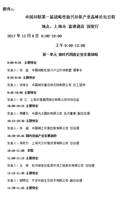 基于以上背景,為加快生活垃圾分類分選科學長效機制的建立,深入交流垃圾焚燒先進技術,分享水、土、氣污染防治經驗,思考危險廢物處理處置行業(yè)未來,中國環(huán)聯(lián)擬以“各路精英共謀行業(yè)可持續(xù)發(fā)展”為主題,于2017年12月8日在上海市舉辦第一屆(2017)戰(zhàn)略性新興環(huán)保產業(yè)高峰論壇。屆時,將邀請固廢處理、垃圾分類、水土氣污染防治等領域卓越企業(yè)代表,高等院校資深專家及政府官員參加,解讀環(huán)保政策、分析市場特點、為環(huán)保企業(yè)戰(zhàn)略性發(fā)展及升級轉型出謀劃策,共同為危廢處置、垃圾分類、垃圾焚燒、土壤修復及水污染防治等環(huán)保細分行業(yè)的健康發(fā)展探索出一條可持續(xù)的道路。