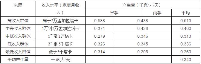 達(dá)卡市不同收入水平人群的廢物產(chǎn)生狀況(1人民幣約合13塔卡)