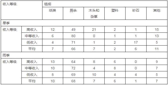 在達(dá)卡市,廢物的產(chǎn)生按重量計算,存在旱季和雨季的差別:在雨季,包括有機(jī)廢物在內(nèi)的各類能夠降解的廢物含有更多的水分,所以重量與旱季時相比會更大。此外,不同收入水平的人群廢物的產(chǎn)生量也存在極大的差異:收入最高人群的人均廢物產(chǎn)生量幾乎是收入最低人群的兩倍。