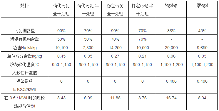 當(dāng)消化污泥的有機(jī)物含量 OTR = 50% 和干化后污泥固含量為90% DS時(shí),污泥熱值大約是Hu = 10,100 kJ/kg 或 2.81 kWh/kg。在以下表 1內(nèi),舉例列出了各種不同類型的消化污泥和好氧穩(wěn)定化污泥性能參數(shù),并和褐煤進(jìn)行比較。根據(jù)污泥熱值,還計(jì)算了干化污泥的熱能商業(yè)價(jià)值。