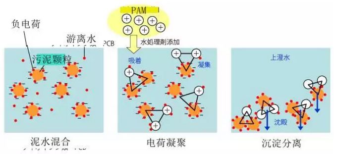 那么什么樣的化學(xué)藥劑可以作用到污泥中這些因素,并能夠?qū)崿F(xiàn)污泥中水分的去除呢?我們來了解一種化學(xué)藥劑,學(xué)名為聚丙烯酰胺,化學(xué)名稱的縮寫為PAM。PAM作為一種聚合藥劑,在水處理中的應(yīng)用廣泛,主要是對泥水混合物進(jìn)行有效的固液分離,從而實現(xiàn)污泥脫水的化學(xué)凝聚作用。對于PAM的制作和特性,在很多文獻(xiàn)中都有,不作為今天主要討論的內(nèi)容。今天就是來看PAM是怎樣實現(xiàn)對泥水混合物的固液分離的,我們來看看這一張圖。