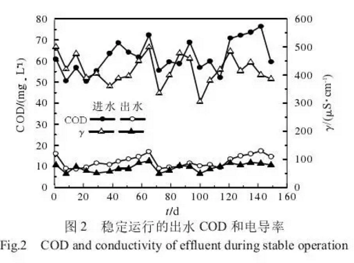 系統(tǒng)穩(wěn)定運(yùn)行出水COD和電導(dǎo)率如圖2所示。