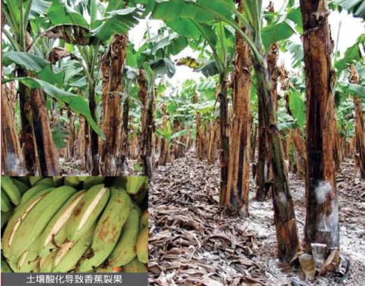 在廣西金穗香蕉公司發(fā)現(xiàn)的裂果香蕉,上億元的香蕉因此爛掉了。經(jīng)我們測試,種植香蕉的土壤很酸,特別是種植時(shí)候要挖深溝,深溝里的生土pH 值只有3 點(diǎn)多到4 點(diǎn)多,鈣鎂吸收量非常低,果皮韌性差,在水分比較多的時(shí)候,果肉膨脹得快,果皮膨脹慢,就會(huì)裂果。后經(jīng)我們的優(yōu)化肥料配方和改良土壤,給金穗公司節(jié)省1800 多萬元成本,徹底解決了裂果問題。公司也建立了一個(gè)有機(jī)肥堆肥廠,生產(chǎn)有機(jī)肥,再施加石灰,來改造酸性土壤。