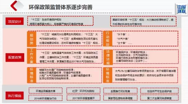 2017年以來(lái),環(huán)保監(jiān)管體系重構(gòu):從頂層政策,如“十三五”生態(tài)環(huán)境保護(hù)規(guī)劃,到水、氣、固、土壤的配套政策,再到環(huán)保垂改、專(zhuān)項(xiàng)整治等具體措施,三位一體重構(gòu)環(huán)保政策監(jiān)管體系,強(qiáng)調(diào)治理效果,提升監(jiān)管力度。在責(zé)任主體、監(jiān)管體系、排污收費(fèi)、排污許可、排污權(quán)交易等五個(gè)方面進(jìn)行重大改革,從多個(gè)方面吸引社會(huì)力量共同改善環(huán)境質(zhì)量,把過(guò)去被動(dòng)化、模糊化的管理變?yōu)榱酥鲃?dòng)化、定量化、清晰化的管理。