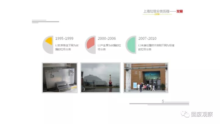 第二階段是發(fā)展階段,從1995年到2010年,上海經(jīng)歷了不同的分類標(biāo)準(zhǔn),一直在探索,從一開(kāi)始以物質(zhì)特性為依據(jù)進(jìn)行垃圾分類,到后來(lái)以產(chǎn)生源為依據(jù)分類,再到2007年,上海開(kāi)始有了垃圾綜合處理的理念,不單填埋一種處置方法,開(kāi)始有了焚燒和生化處置,因此開(kāi)始了以末端處理技術(shù)類別來(lái)分類。