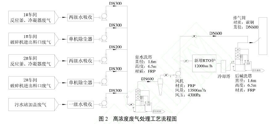 將合成釜、蒸水釜、脫溶釜廢氣收集后先接入兩級水吸收,再接入高濃度廢氣焚燒系統(tǒng)。
