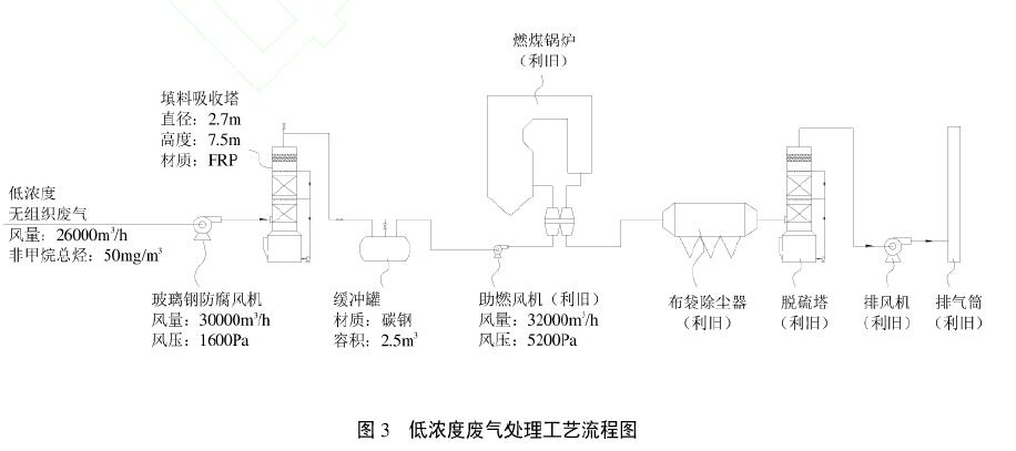2)配料間、破碎間等局部區(qū)域換風(fēng)廢氣有具有風(fēng)量大、濃度低的特點,經(jīng)水吸收預(yù)處理后可作為助燃?xì)饨尤肴济哄仩t進(jìn)行焚燒處理,燃煤鍋爐無需改造,助燃風(fēng)機(jī)和排風(fēng)機(jī)也能滿足要求,幾乎不影響燃煤鍋爐的運(yùn)行。
