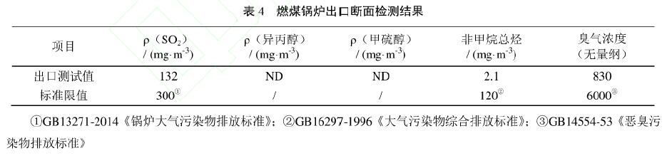 配料間、破碎間等的空間換風(fēng)有一定異味,換風(fēng)廢氣流量大,其中異丙醇等有機(jī)物濃度遠(yuǎn)低于爆炸極限的下限,改造方案采用水吸收進(jìn)行預(yù)處理,再作為補(bǔ)風(fēng)接入現(xiàn)有燃煤鍋爐經(jīng)1000℃左右高溫焚燒后排放。鍋爐排氣筒(高度25m)檢測結(jié)果如表4所示,結(jié)果表明利用燃煤鍋爐處理低濃度有機(jī)廢氣可有效控制異味污染。系統(tǒng)設(shè)計風(fēng)量26000m3/h,總投資約35萬元,運(yùn)行費(fèi)為768元/天,主要為電費(fèi)。