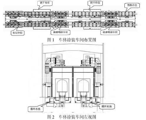 太原軌道交通裝備有限責(zé)任公司太原廠(以下簡(jiǎn)稱“太原廠”)車體涂裝車間采用的就是濕式除漆霧的工藝流水線。車體涂裝車間布置及其左視圖如圖1和圖2所示。