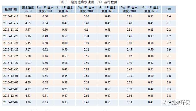 從超濾出水的 SDI 數(shù)據(jù)看,均可以控制在 2.4以下,滿足反滲透進(jìn)水 SDI 不大于 4 的控制要求。從表 3 數(shù)據(jù)還可發(fā)現(xiàn),超濾出水 SDI 基本無(wú)大波動(dòng),具有良好的運(yùn)行穩(wěn)定性。