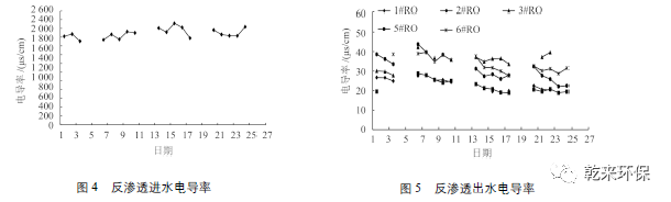 3.3 反滲透進(jìn)出水電導(dǎo)率:電導(dǎo)率是反應(yīng)水中含鹽量的間接指標(biāo),因便于測(cè)定而被廣泛采用。反滲透進(jìn)水和出水電導(dǎo)率變化分別見(jiàn)圖 4 和圖 5。
