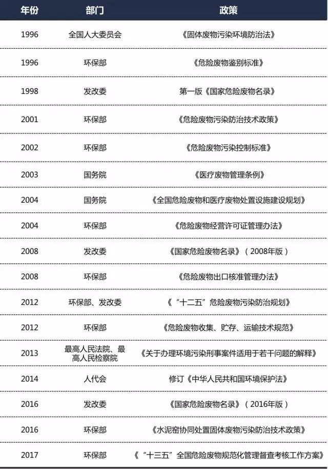 危廢政策不斷出臺,尤其是省級細(xì)則落地:1)2017年環(huán)保部出臺“十三五”全國危險(xiǎn)廢物規(guī)范化管理督查考核工作方案,各省近期均推出省級危廢規(guī)范化管理督查方案;2)《國家危險(xiǎn)廢物名錄》自2016年8月1日起施行;新修訂的《固體廢物污染環(huán)境防治法》取消危險(xiǎn)廢物省內(nèi)轉(zhuǎn)移審批手續(xù);3)2016年最高司法機(jī)關(guān)就環(huán)境污染犯罪出臺專門司法解釋;4)2018年起實(shí)施《環(huán)境保護(hù)稅法》,危廢稅額1000元/噸;5)環(huán)保部發(fā)布《水泥窯協(xié)同處置固體廢物污染防治技術(shù)政策》,支持水泥窯協(xié)同處置。