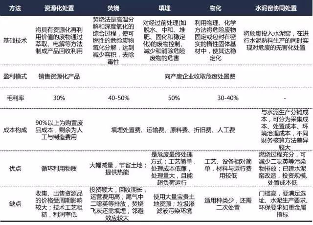我國危廢處理方式基本以無害化處理及資源化利用為主。資源化利用的模式為危廢資源化企業(yè)向上游產(chǎn)廢企業(yè)收取有利用價(jià)值的廢物,再提純生產(chǎn)為資源化產(chǎn)品,收入來自于銷售產(chǎn)品,盈利受上游廢物價(jià)格及下游金屬價(jià)格影響。無害化處置是處置企業(yè)向產(chǎn)廢企業(yè)收取費(fèi)用,主要包括焚燒、填埋、物化,水泥窯協(xié)同處置也可列為無害化處置的方法。無害化毛利較高,焚燒毛利可達(dá)40%以上,填埋毛利50%以上。水泥窯協(xié)同處置與水泥生產(chǎn)共攤成本,邊際成本較低。