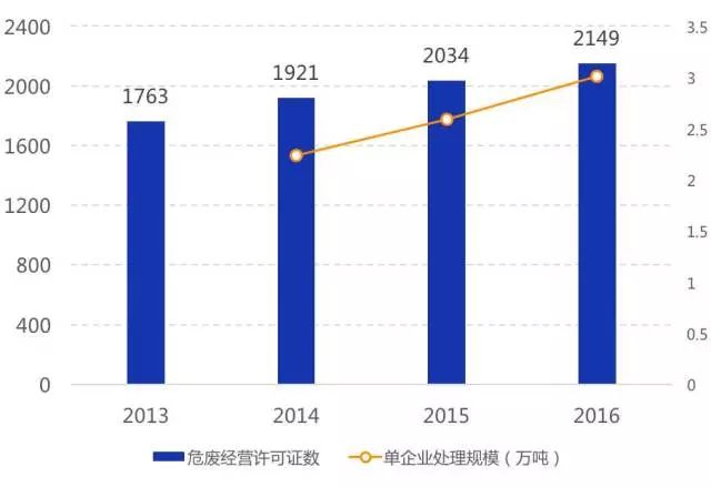 資質(zhì)企業(yè)平均規(guī)模較?。?016年我國持危險(xiǎn)廢棄物經(jīng)營許可證的企業(yè)數(shù)量為2149家,2016年凈增加僅115家,體現(xiàn)出環(huán)保系統(tǒng)對新頒發(fā)許可證愈發(fā)謹(jǐn)慎;平均每家處理量僅不到3萬噸,呈現(xiàn)較強(qiáng)的分散性特征,但單企業(yè)處理規(guī)模由2014年2.2萬噸/年增加到2016年3.0萬噸/年,未來隨著許可證頒發(fā)與復(fù)核難度加大,實(shí)力弱、技術(shù)差的小企業(yè)將被淘汰出市場,龍頭擴(kuò)張,單企業(yè)規(guī)模繼續(xù)擴(kuò)大。