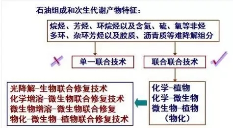 石油是烷烴、芳烴、環(huán)烷烴及含氮、硫、氧等非烴類組分的混合物,其中多環(huán)、雜環(huán)芳烴以及膠質(zhì)、瀝青質(zhì)等組分生物降解性較差。石油及次生代謝產(chǎn)的組成特征決定了修復(fù)的難度和復(fù)雜性。因此,單一聯(lián)合技術(shù)不能很好的解決污染問題時,需要考慮聯(lián)合使用各種處理技術(shù)。