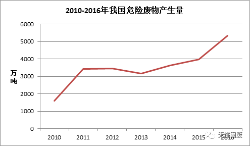 工業(yè)行業(yè)是我國(guó)危險(xiǎn)廢物的主要來(lái)源,根據(jù)2017中國(guó)統(tǒng)計(jì)年鑒顯示,2016年全國(guó)工業(yè)危險(xiǎn)廢物產(chǎn)生量為5347.3萬(wàn)噸,同比增長(zhǎng)34.49%。