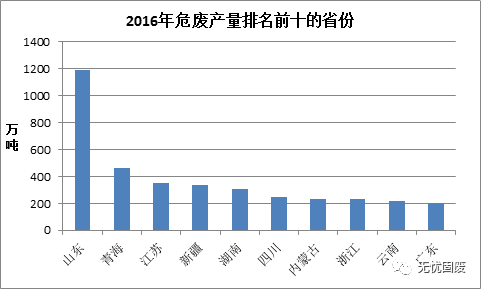 其中山東危廢產(chǎn)生量最多,高達(dá)1188.28萬(wàn)噸,其次是青海,產(chǎn)生量為462.05萬(wàn)噸,江蘇危廢產(chǎn)生量為350.98萬(wàn)噸,排名第三。
