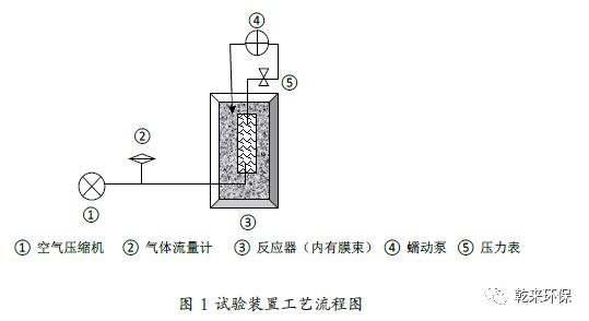 2.1 實(shí)驗(yàn)裝置:試驗(yàn)裝置為一體式MBR 裝置,由柱形玻璃容器組成MBR 反應(yīng)器,內(nèi)部采用管式中空纖維聚偏氟乙烯膜組件(PVDF)。反應(yīng)器有效容積為10 L,膜組件(PVDF)表面積0.3 m2,膜絲內(nèi)徑3cm,膜絲孔徑0. 4um,臨界膜通量為20 L/m2.h。試驗(yàn)中通過(guò)蠕動(dòng)泵抽吸膜孔通道控制出水。膜組件下方設(shè)有曝氣管,曝氣強(qiáng)度由氣體流量計(jì)控制。工作流程如圖1。