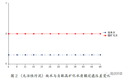 3.1 無(wú)活性污泥條件下自配高礦化水對(duì)膜污染影響:通過(guò)對(duì)兩種水質(zhì)跨膜壓差的測(cè)定,研究高礦化水質(zhì)對(duì)膜通量的影響以及膜兩側(cè)離子濃度的變化。試驗(yàn)過(guò)程中采用同一膜,反應(yīng)器中不加入活性污泥,產(chǎn)水通量均設(shè)置為17 L/m2.h、試驗(yàn)溫度相同均為14℃,全過(guò)程不進(jìn)行曝氣和反沖,經(jīng)過(guò)48 小時(shí)的抽吸水,每隔4 小時(shí)分別測(cè)定膜過(guò)濾壓差。(1)跨膜壓差隨時(shí)間的變化研究。在相同試驗(yàn)條件下,測(cè)得自來(lái)水和自配高礦化水兩種水質(zhì)48 小時(shí)內(nèi)膜過(guò)濾壓差都沒(méi)有變化,跨膜壓差分別為5.3 kpa、6.0 kpa,可見(jiàn),自配高礦化水中無(wú)機(jī)鹽離子對(duì)膜污染有一定的貢獻(xiàn)。如圖2 所示。