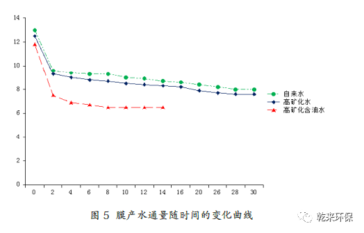 從表3 中可以看出,在蠕動(dòng)泵同樣抽吸的情況下,自來(lái)水、自配高礦化水和高礦化含油水三種水質(zhì)條件下,膜穩(wěn)定壓差依次增大,到達(dá)穩(wěn)定壓差時(shí)膜的產(chǎn)水通量依次減小,表明無(wú)機(jī)鹽類(lèi)離子、油類(lèi)物質(zhì)、機(jī)雜等均造成膜的孔徑堵塞,對(duì)膜產(chǎn)生污染影響。