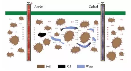 3.電動(dòng)修復(fù)法:是一種原位土壤修復(fù)技術(shù)。通過(guò)向污染土壤中置人電極,并通以低壓直流電形成電場(chǎng)。在電勢(shì)梯度作用下產(chǎn)生的電動(dòng)效應(yīng)(電滲析、電遷移和電泳)會(huì)驅(qū)動(dòng)土壤中的流體介質(zhì)發(fā)生定向移動(dòng),從而使污染物伴隨主體流動(dòng)從土壤中移除
