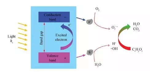 3. 光催化降解:是當(dāng)半導(dǎo)體材料吸收的光能大于或等于半導(dǎo)體禁帶寬度時(shí),電子由半導(dǎo)體的價(jià)帶躍遷到導(dǎo)帶上產(chǎn)生高活性電子e 。同時(shí),在原來(lái)的價(jià)帶上形成1 個(gè) 空 穴h+ 。產(chǎn)生的空穴具有極強(qiáng)的氧化性(即獲取電子的能力),可以與水作用形成羥基自由基·OH),從而直接將有機(jī)物降解為小分子物質(zhì)。