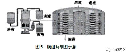 震動膜的工作原理就是針對膜濃縮的兩個難點來設(shè)計的。震動膜主要由兩個部分組成,膜組和使膜組產(chǎn)生往復(fù)運動的振動機械。膜組里是圓形的平板膜,膜片可按需求使用不同精度的膜材。膜片與膜片的間隙為3 mm,進口通道比較寬,有效避免了在進口位置產(chǎn)生結(jié)垢。進液在壓力作用下從進口流到濃液口。在進料泵壓力下,清液通過膜片,鹽份被截留。膜組剖面示意見圖5。