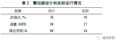 這兩項設(shè)計可以使廢水在不除硬的前提下進行濃縮。按現(xiàn)有的實踐經(jīng)驗,震動膜濃液TDS 濃度可達100 000 μg/g。濃縮比可以達到90%,即可減少蒸發(fā)量達90%。產(chǎn)水TDS 濃度約為100mg ˙ L-1 以下,完全滿足回用要求。