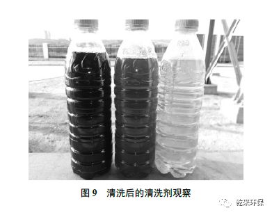 圖8 中A、B 膜片在清洗前發(fā)現(xiàn)有大量膠狀有機物,通過化學(xué)清洗后可以恢復(fù)潔白(如圖8C 所示),清洗出來的殘余物D 為塊狀物質(zhì)。因而化學(xué)清洗可以令膜再生。但實際上該膜組的清洗程度并不夠。通過對該項目正運行的膜組連續(xù)進行三次化學(xué)清洗,每次對清洗浸泡液取樣觀察(見圖9)。