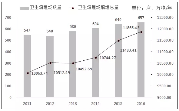 2011-2016年生活垃圾衛(wèi)生填埋場數(shù)量及衛(wèi)生填埋年處理量
