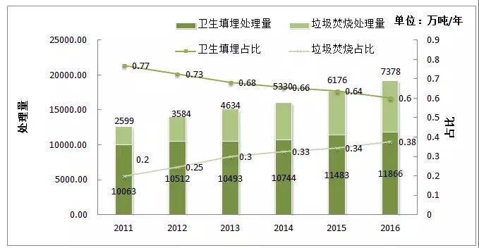 2011-2016 城市垃圾處理量及占比走勢 (注:數(shù)據(jù)來自住建部國家統(tǒng)計年鑒)