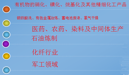有機(jī)化工產(chǎn)品如檸檬酸、氨基磺酸、草酸、硫酸二甲酸、合成甲酚、十二烷基苯磺酸等產(chǎn)品及磺化、硝化、烷基化、酯化等化學(xué)反應(yīng)單元,這些反應(yīng)廣泛用于農(nóng)藥、醫(yī)藥、染料、香料等行業(yè)生產(chǎn),都大量用到硫酸。每年應(yīng)用于有機(jī)化工產(chǎn)品的硫酸在1000-1500萬噸,其中有參與化學(xué)反應(yīng),同時產(chǎn)生大量20-60%的廢硫酸,保守統(tǒng)計,應(yīng)該在2000萬噸以上部分。