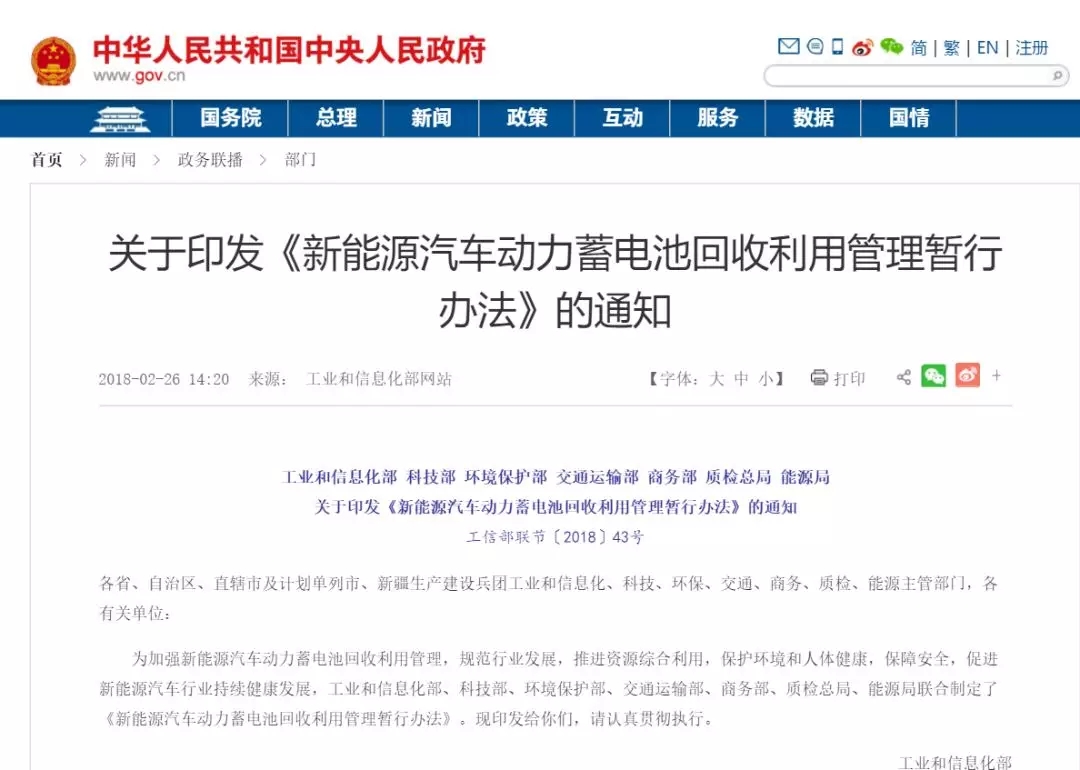2月26日,工業(yè)和信息化部、科技部、環(huán)境保護部、交通運輸部、商務(wù)部、質(zhì)檢總局、能源局印發(fā)《新能源汽車動力蓄電池回收利用管理暫行辦法》的通知,旨在加強新能源汽車動力蓄電池回收利用管理,規(guī)范行業(yè)發(fā)展。