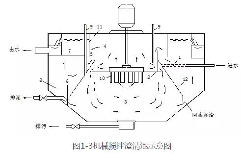 機(jī)械攪拌澄清池是一種泥渣循環(huán)型澄清池,池體由第一反應(yīng)室、第二反應(yīng)室和分離室三部分組成,見(jiàn)圖1-3。