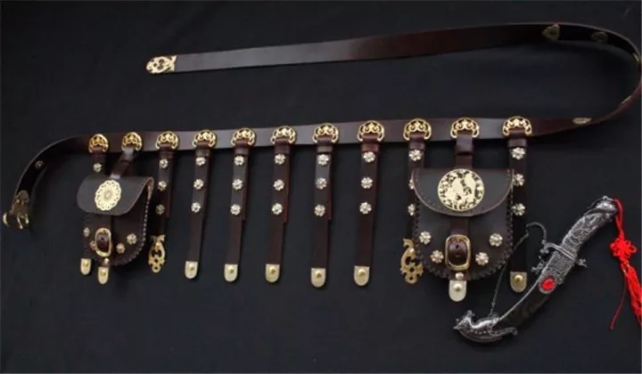 《新唐書》中有關(guān)于服裝形制的記載,唐人常配有一種叫蹀躞(dié xiè)七事的腰帶,上面掛著七種不同用處的物件,哪七種?分別為:佩刀、刀子、礪石、契苾真、噦厥、針筒、火石。這個噦厥(yuě jué),就是我們生活中常見的垃圾袋。
