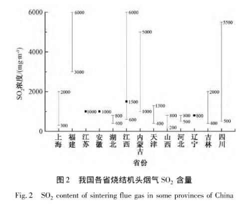 燒結(jié)機(jī)頭煙氣中SO2因燒結(jié)原料的配比、鋪料方式、燒結(jié)工況等因素影響,波動(dòng)很大,不同地區(qū)原料不同,差異明顯。我國(guó)各地區(qū)燒結(jié)機(jī)頭煙氣中SO2含量見(jiàn)圖2。
