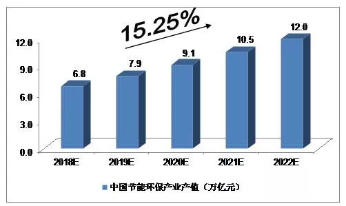 “十二五”以來,我國(guó)節(jié)能環(huán)保產(chǎn)業(yè)發(fā)展勢(shì)頭強(qiáng)勁,產(chǎn)值由2010年的2萬(wàn)億元增長(zhǎng)到2015年的4.55萬(wàn)億元。我們預(yù)計(jì),2018年我國(guó)節(jié)能環(huán)保產(chǎn)業(yè)產(chǎn)值將達(dá)到6.8萬(wàn)億元,未來五年(2018-2022)年均復(fù)合增長(zhǎng)率約為15.25%,2022年將達(dá)到12.0萬(wàn)億元。