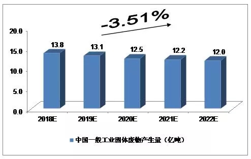 2015年,246個(gè)大、中城市一般工業(yè)固體廢物產(chǎn)生量達(dá)19.1億噸;2016年,214個(gè)大、中城市一般工業(yè)固體廢物產(chǎn)生量達(dá)14.8億噸。我們預(yù)計(jì),2018年中國(guó)一般工業(yè)固體廢物產(chǎn)生量將達(dá)到13.8億噸,未來五年(2018-2022)行業(yè)年均復(fù)合增長(zhǎng)率約為-3.51%,2022年達(dá)到12.0億噸。