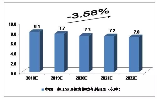 2015年,246個(gè)大、中城市一般工業(yè)固體廢物綜合利用量達(dá)11.8億噸;2016年,214個(gè)大、中城市一般工業(yè)固體廢物綜合利用量達(dá)8.6億噸。我們預(yù)計(jì),2018年中國(guó)一般工業(yè)固體廢物綜合利用量將達(dá)到8.1億噸,未來五年(2018-2022)行業(yè)年均復(fù)合增長(zhǎng)率約為-3.58%,2022年達(dá)到7.0億噸。