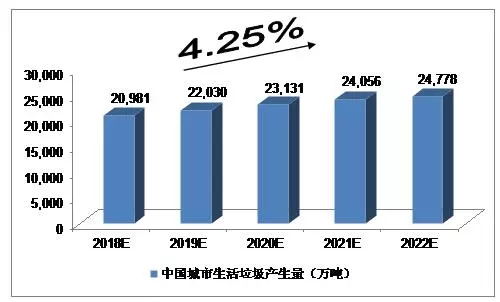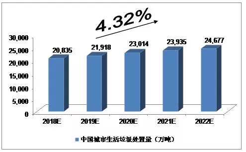 2015年,246個(gè)大、中城市生活垃圾產(chǎn)生量為18,564.0萬(wàn)噸;2016年,我國(guó)214個(gè)大、中城市生活垃圾產(chǎn)生量18,850.5萬(wàn)噸。我們預(yù)計(jì),2018年中國(guó)城市生活垃圾產(chǎn)生量將達(dá)到20,981萬(wàn)噸,未來五年(2018-2022)行業(yè)年均復(fù)合增長(zhǎng)率約為4.25%,2022年達(dá)到24,778萬(wàn)噸。