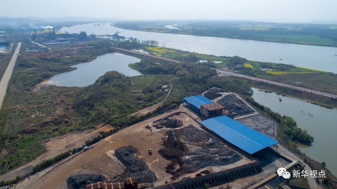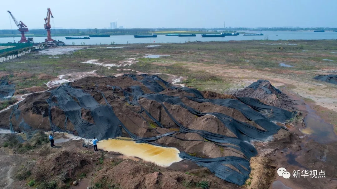這是3月29日用無(wú)人機(jī)拍攝的安徽貴池前江工業(yè)園內(nèi)池州恒鑫材料科技有限公司廠(chǎng)區(qū)內(nèi)的長(zhǎng)江堤岸旁?xún)A倒的選礦尾渣。新華社記者 郭晨 攝