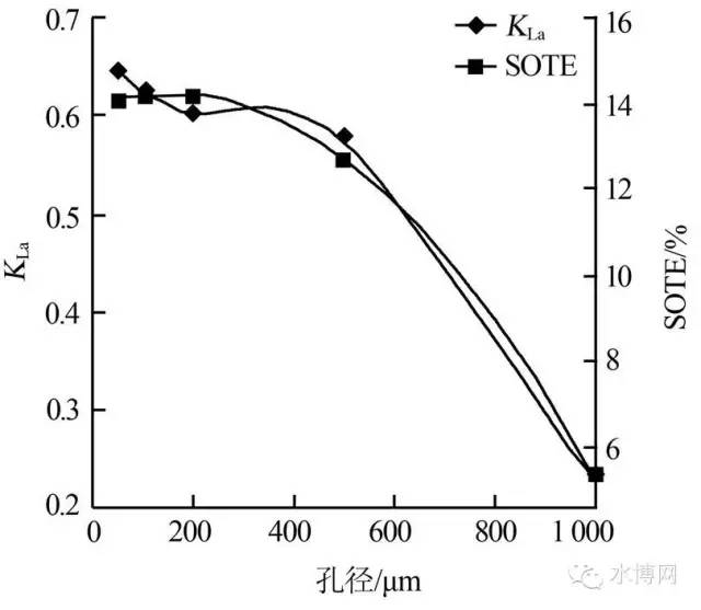 孔徑對(duì)氣泡的形成有很大影響,孔徑越大,氣泡的尺寸越大〔11〕。氣泡對(duì)充氧性能的影響主要表現(xiàn)在兩個(gè)方面:一是單個(gè)氣泡越小,整體氣泡的比表面積越大,氣液間傳質(zhì)接觸面積越大,越有利于氧氣的轉(zhuǎn)移;二是氣泡越大,對(duì)水體的攪動(dòng)作用越強(qiáng),氣液之間混合越快,充氧效果越好。往往第一點(diǎn)在傳質(zhì)過程中起主要作用。試驗(yàn)將曝氣量設(shè)定為0.5m3/h,考察孔徑對(duì)KLa和氧利用率的影響,見圖4。