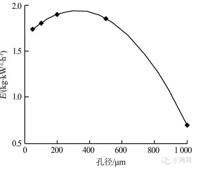 由圖5可知,理論動(dòng)力效率隨孔徑的增加呈先增大后減小的趨勢(shì)。這是因?yàn)橐环矫嫘】讖?a target="_blank" title="曝氣新聞專題">曝氣器具有較大的KLa和充氧能力,有利于充氧的進(jìn)行。另一方面,一定水深下阻力損失隨孔徑的減小而增大。當(dāng)孔徑減小對(duì)阻力損失的促進(jìn)作用大于氧傳質(zhì)作用時(shí),理論動(dòng)力效率就會(huì)隨孔徑的減小而降低。因此孔徑較小時(shí)理論動(dòng)力效率會(huì)隨孔徑增大而增大,并于孔徑200μm處達(dá)到最大值1.91kg/(kW˙h);當(dāng)孔徑>200μm時(shí),阻力損失在曝氣過程中不再起主導(dǎo)作用,KLa和充氧能力會(huì)隨著曝氣器孔徑的增加而減小,因而理論動(dòng)力效率呈明顯下降趨勢(shì)。