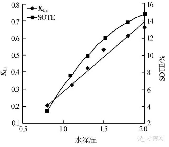 圖6表明,隨著水深的增加,KLa和氧利用率均呈明顯的增大趨勢(shì),KLa在水深0.8m處和水深2m處相差4倍多。這是因?yàn)樗钤酱?,氣泡在水體中的停留時(shí)間越長,氣液接觸時(shí)間就越長,氧傳質(zhì)效果越好。