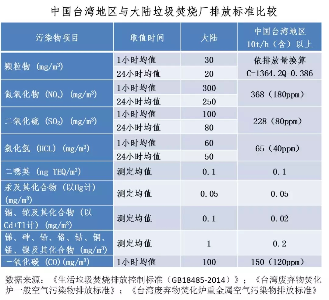生態(tài)環(huán)境部于2014年5月16日發(fā)布《生活垃圾焚燒排放控制標(biāo)準(zhǔn)》(GB18485-2014)。對(duì)比大陸和臺(tái)灣的生活垃圾焚燒爐排放污染物限值(取10t/h以上焚燒爐標(biāo)準(zhǔn))可見(jiàn),一是針對(duì)氮氧化物、二氧化硫、氯化氫、一氧化碳等大氣污染物,大陸已制定了相較臺(tái)灣更為嚴(yán)格的標(biāo)準(zhǔn);二是針對(duì)重金屬類(lèi)特征污染物,臺(tái)灣的控制要求更加嚴(yán)格。